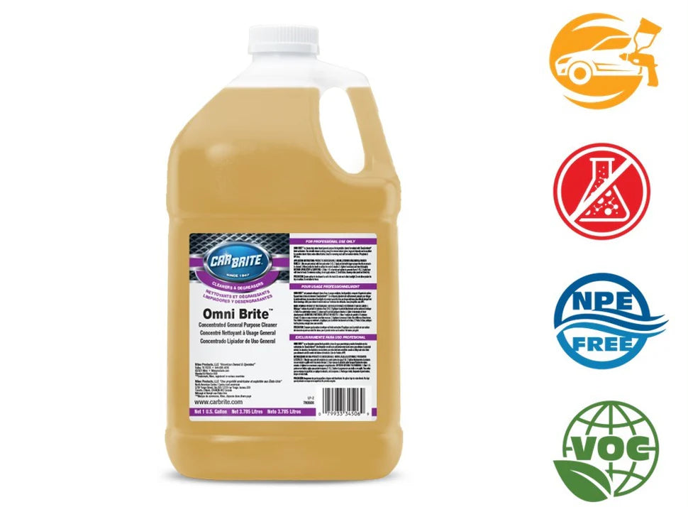 Car Brite Omni Brite is a versatile all-purpose cleaner that will allow you to effectively clean multiple surfaces of both your vehicle’s interior and exterior. By simply adjusting the dilution ratio, you can use Omni Brite to clean everything from the bug remains and grime on your car’s paint to the dirt and salt trapped in your sensitive interior fabrics. Omni Brite is water based to be safe for the user, the environment, and your vehicle. It is compliant with all VOC laws and regulations to ensure that it meets the safety requirements for use in any capacity. The safety of Omni Brite is amplified even further due to the use of CleanGredients® listed surfactants in its formula. It is also formulated without any glycol ether or solvents to minimize the risk of damage to the surfaces it is used on. Using Omni Brite will allow you to save money on product cost due to its highly concentrated formula.